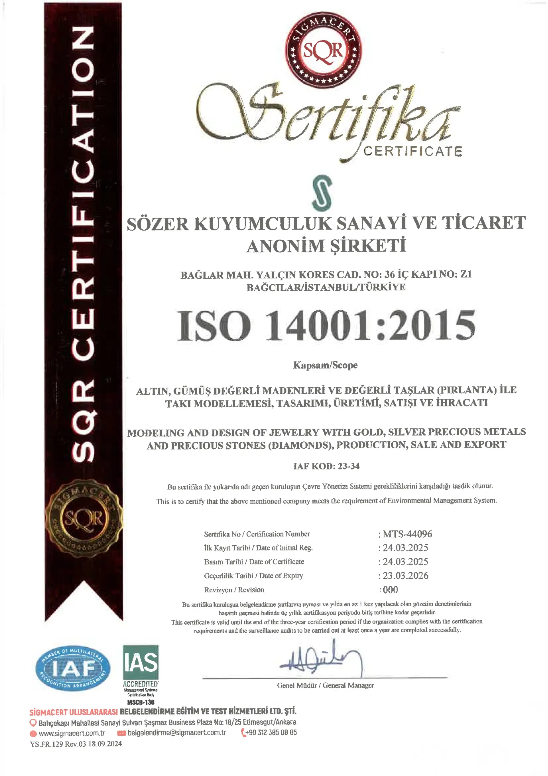 ISO 14001 sertifikası, çevresel sürdürülebilirliğe olan bağlılığımızı pekiştirir. Çevre bilincine sahip olmanın öneminin farkındayız ve çevresel etkilerimizi en aza indirmek için sağlam sistemler uygulamaya koyduk. Bu sertifika, sürdürülebilir uygulamaları teşvik etme, atıkları azaltma ve kaynakları koruma yönündeki çabalarımızı sergiler ve çevreye duyarlı bir operasyon yürüttüğümüzü gösterir.