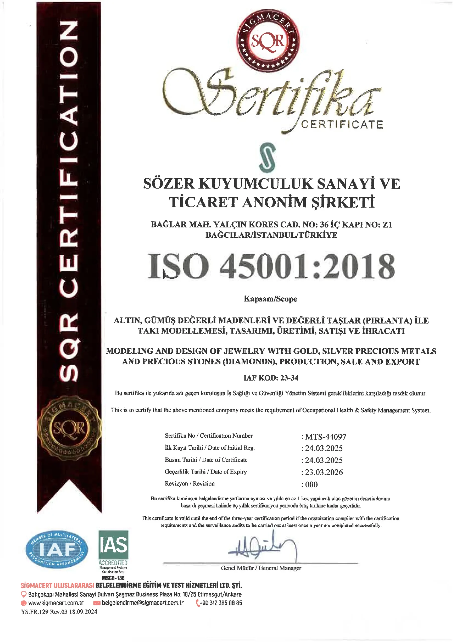 ISO 45001 sertifikası, iş sağlığı ve güvenliği alanındaki en yüksek standartları sürdürme taahhüdümüzü vurgular. Çalışanlarımızın refahını ön planda tutarak güvenli ve sağlıklı bir çalışma ortamı oluşturmayı amaçlıyoruz.Bu sertifika, risk yönetimine yönelik proaktif yaklaşımımızı ve iş kazaları ile meslek hastalıklarını önlemeye yönelik kararlılığımızı ortaya koyar.